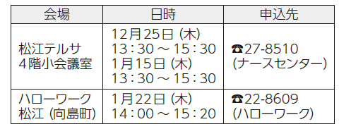 その他:上記以外の平日10:00~16:00はナースセンターで就業相談を行っています。電話連絡の上お越しください。