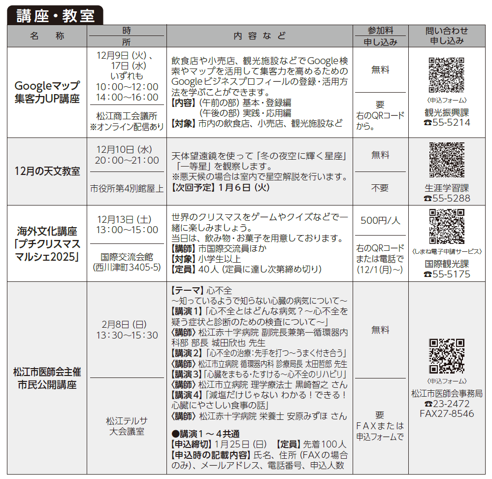 講座 講座・教室 40/53 前の記事 次の記事 発行日 : 2025年12月01日 自治体名 : 島根県松江市 広報紙名 : 市報松江 2025年12月号 Tweet シェアする 消費者教育ミニコーナー 市立図書館 移動図書館車(本のかけはし『だんだん号』)巡回日程(12月)