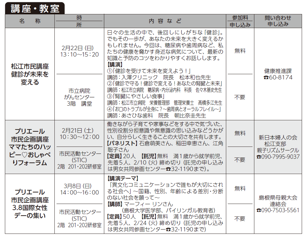 講座 講座・教室 32/51 前の記事 次の記事 発行日 : 2026年02月01日 自治体名 : 島根県松江市 広報紙名 : 市報松江 2026年2月号 Tweet シェアする 講演会参加者募集 講演会のお知らせ~サプリメント、健康食品との付き合い方を考える!~ 市立図書館移動図書館車(本のかけはし『だんだん号』)巡回日程(2月)