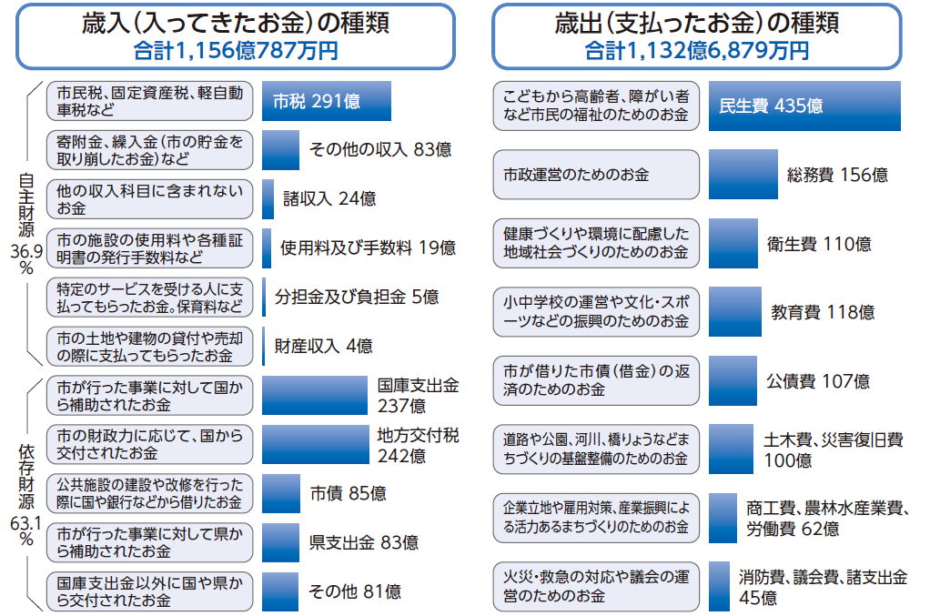 依存財源…国・県から交付される収入や借入金など自主的に収入を決めることができない財源