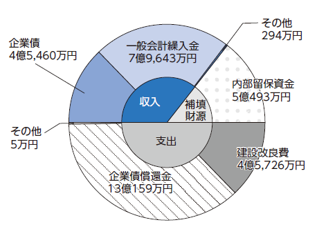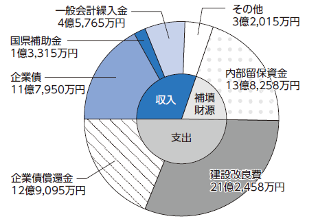 ※収入のうち1億2,960万円は前年度支出、800万円は翌年度繰越額の財源。また、上記収入のほかに企業債2億2,250万円を6年度財源として翌年度に収入。
