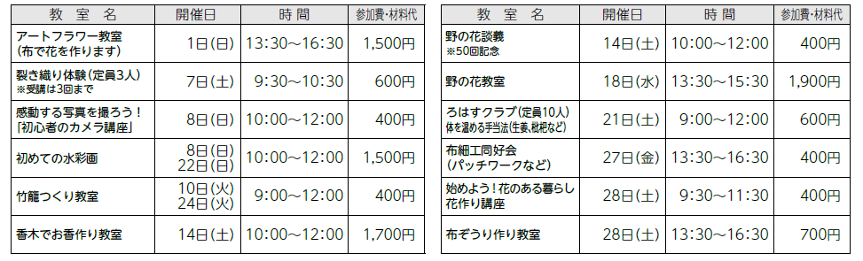 ※各教室とも、準備の都合上2日前までにご連絡ください。定員になり次第締め切ります。