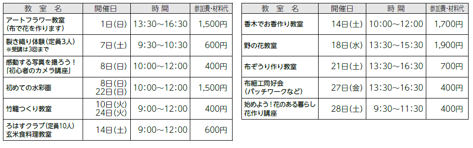 ※各教室とも、準備の都合上2日前までにご連絡ください。定員になり次第締め切ります。
