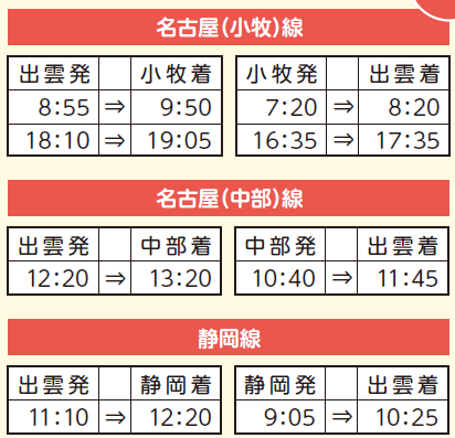 2025年10月26日~11月30日と、2026年3月20日~28日の期間の一部日程(金曜日から日曜日及び月曜日が祝日の場合は月曜日)において、名古屋(小牧)線は1日2往復から1日3往復に増便して運航します。