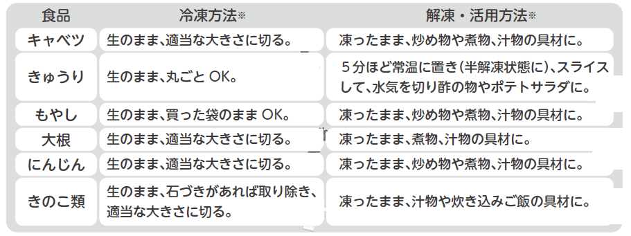 ※冷凍方法及び解凍・活用方法は一例を紹介しています。冷凍することにより、多少食感や風味が変化するものがあります。