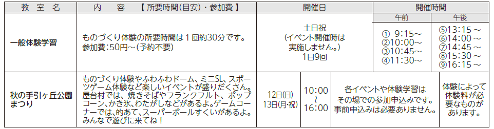 ※体験学習は、団体予約がある場合は参加できません。電話でお確かめください。