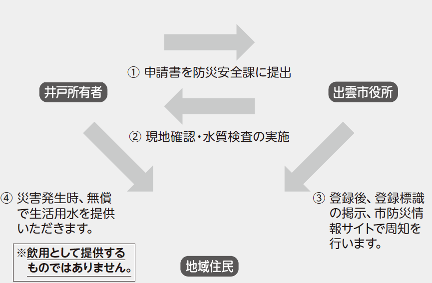 市では、地震などの災害が発生し、水道の給水が停止した際、被災者の皆さまに、生活用水(トイレ、掃除、洗濯などに使用する水)として、無償で井戸水を提供いただける協力者を募集し、協力者所有の井戸を「災害時協力井戸」として登録しています。