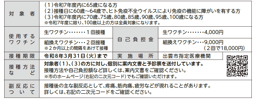 ・組換えワクチンは2か月以上の間隔を空けて2回接種となっています。接種期限までに2回の接種を受けるためには、1回目を遅くとも令和8年1月31日(土)までに受けてください。