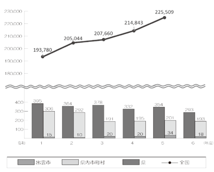児童相談所(県)と出雲市・県内市町村が対応した児童虐待相談対応件数の推移