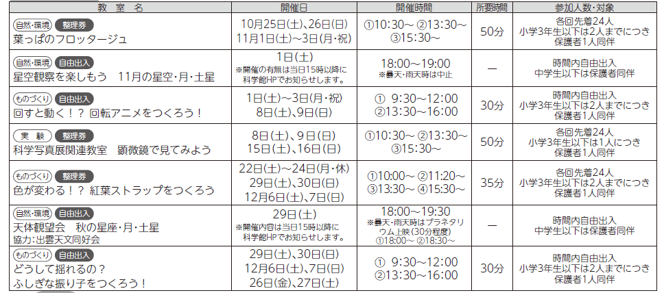 この他にも、ボランティアさんのわくわくかがくひろば「紙でコースターをつくろう」〔15日(土)、16日(日)、22日(土)、23日(日・祝)、24日(月・休)〕があります。詳しくは出雲科学館(25-1500)へお問い合わせください。