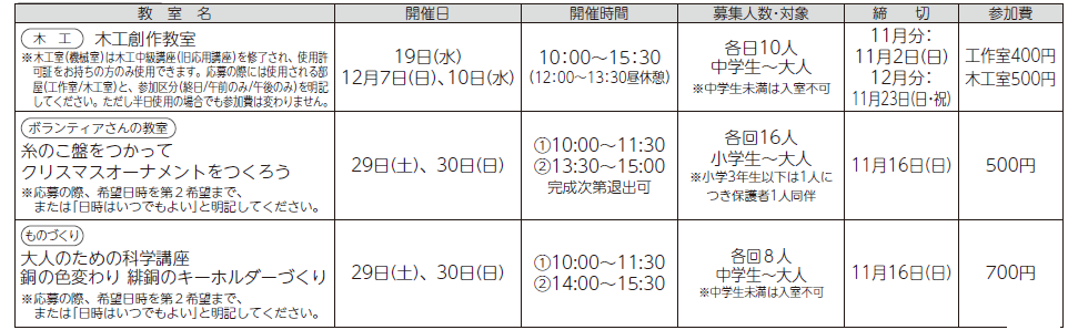 〔整理券〕教室に参加するには整理券が必要です。開館時刻(9:30)からその日に行われる教室の整理券を受付カウンターで配付します。1人につき2人分(ご本人分含む)まで、代理人受取可能です。(ただし、保護者同伴が必要な方は代理人になれません。)教室回数や定員など状況によっては変更となる場合があります。