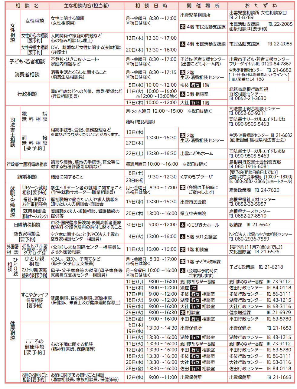 下記に掲載されていない相談事業(交通事故相談、難病相談、不動産無料相談、商工相談など)については、本紙の二次元コードからご確認ください。