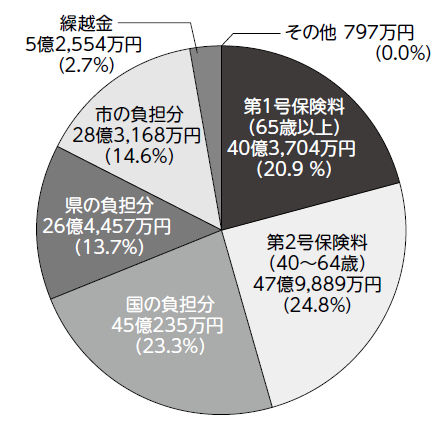 65歳以上の人に納めていただく保険料(第1号被保険者保険料)と、40歳から64歳の人に納めていただく保険料(第2号被保険者保険料)、国、県、市の負担分などで事業を行っています。