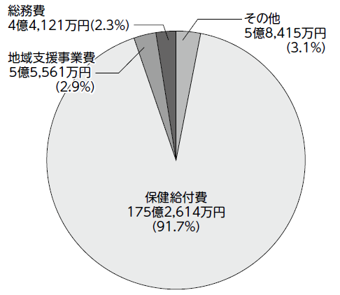 要介護(要支援)の認定を受けて利用する、デイサービス、ショートステイ、施設サービスや認知症グループホームなどの介護サービス費である「保険給付費」の割合が大半を占めています。