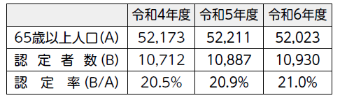 高齢者数は横這い、要支援・要介護認定者数は増加傾向にあります。