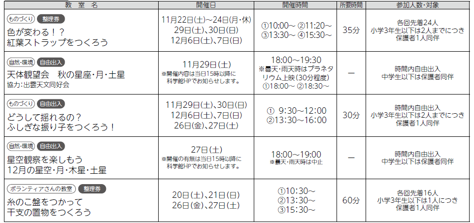 この他にも、ボランティアさんのわくわくかがくひろば「まつぼっくりでクリスマスツリー」〔13日(土)、14日(日)、20日(土)、21日(日)〕があります。詳しくは出雲科学館(25-1500)へお問い合わせください。