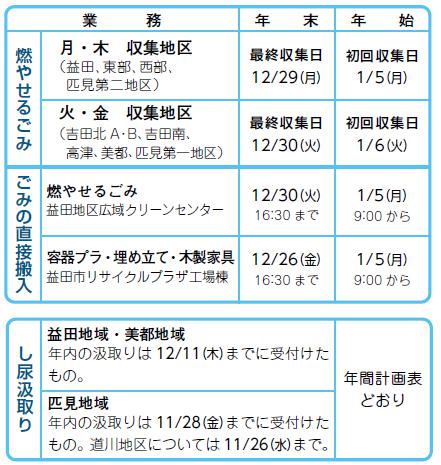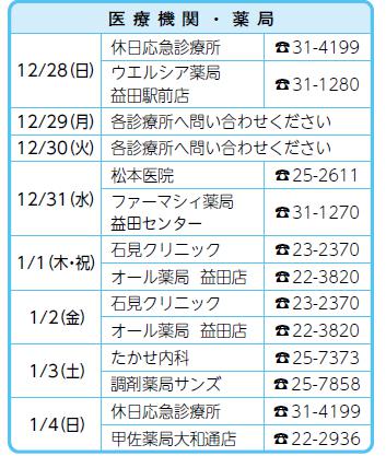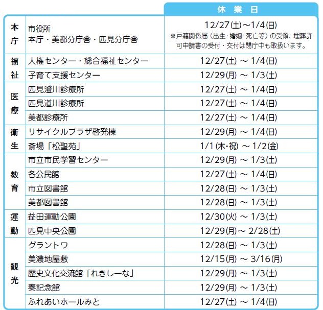 くらし 年末年始休業のご案内 35/40 前の記事 次の記事 発行日 : 2025年12月01日 自治体名 : 島根県益田市 広報紙名 : 広報ますだ 令和7年12月号 ■施設関係 ■衛生関係「ごみ出しは計画的に」 ■休日応急診療 ※受診の際は、必ず事前に電話で連絡をしてください ※受付時間:9:00~12:30(電話受付8:40~) Tweet シェアする こんにちは としょかんです リサイクルプラザ通信 第270号