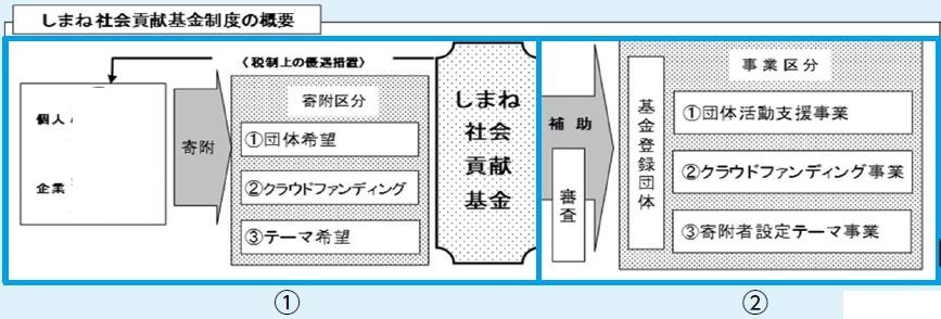 島根県では、県民や企業の皆さんからの寄附金を原資に「しまね社会貢献基金」を造成し※(1)、社会貢献活動を行う団体へ活動経費の助成を行なっています※(2)。