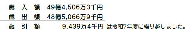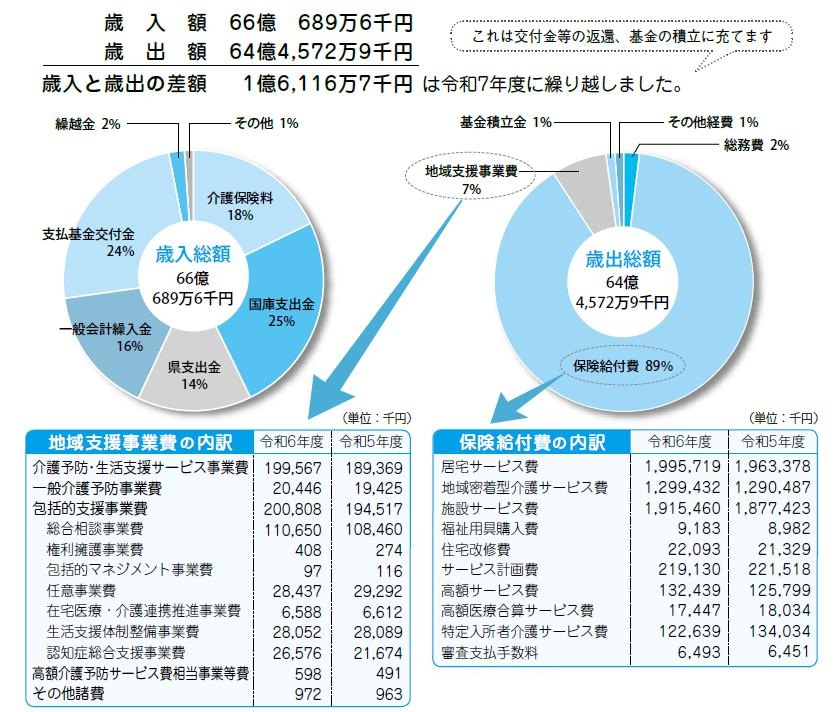 歳入と歳出の差額2,018万7千円は、令和7年度に繰り越しました。これは、後期高齢者医療広域連合保険料等納付金等の財源となります。