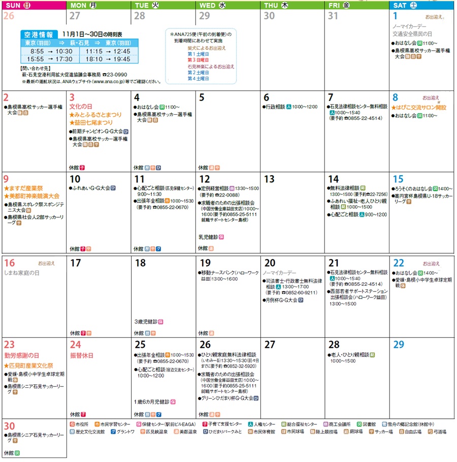 くらし ますだ 11月カレンダー 24/54 前の記事 次の記事 発行日 : 2025年11月01日 自治体名 : 島根県益田市 広報紙名 : 広報ますだ 令和7年11月号 ◆今月は国民健康保険税(6期)、後期高齢者医療保険料(5期)、介護保険料(6期)の納付月です。 Tweet シェアする 11月25日~12月1日は犯罪被害者週間です 献血・健康相談・休日診療場所・当番薬局など