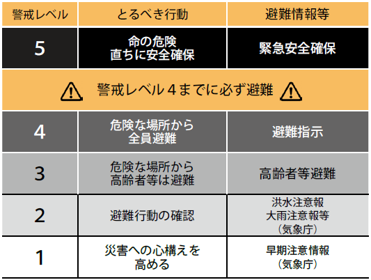 警戒レベル5は、すでに安全な避難ができず、命が危険な状況です。警戒レベル4までに、危険な場所から必ず避難してください。警戒レベル3では、避難に時間のかかる高齢者や障がいのある人は、避難しましょう。それ以外の人も避難の準備を始め、危険を感じたら自らの判断で避難してください。