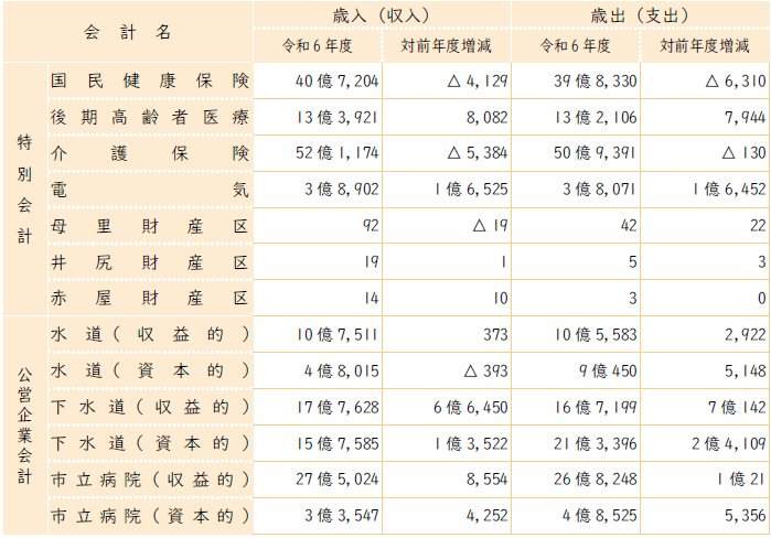 いずれも国民健康保険税や介護保険料、水道料金、医業収入など特定の収入を財源に事業を行っており、その収支状況を明らかにするため一般会計とは分けています。