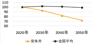 人口減少が進むことで、医療の需要も減少していきます。安来市では、2050年に2020年と比較して医療需要が約28%減少すると予測されています。
