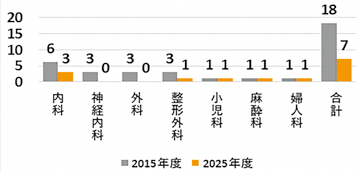 現在、常勤医師数はピーク時の半数以下に減少しています。総合内科の医師を確保して総合診療や訪問診療を強化する一方で、対応できる疾患や救急の受け入れに制限が生じています。