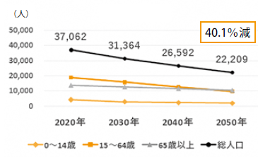 さらに、2050年には総人口が約22,000人まで減少し、65歳以上の老年人口が、15歳~64歳の生産年齢人口を上回ることが予測されています。これは、2020年と比較して約40%の人口減少にあたり、高齢者の割合も40%を超える見込みです。