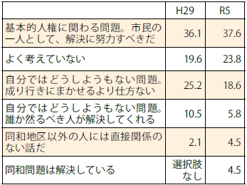 平成29年と令和5年の市民意識調査によると、「成り行きに任せる」「誰かが解決してくれる」(人まかせ)「自分には関係ない」(他人事)「よく考えていない」(無関心)といった考え方や、「同和問題は解決済み」という誤った認識を持つ人が依然として多く見られました。