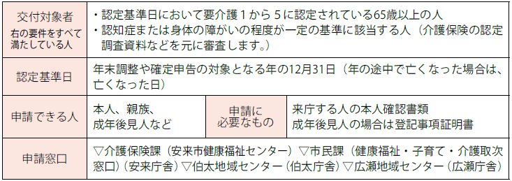 介護保険の要介護認定者のうち、障がい者に準ずると認められる人に、年末調整や確定申告時に障がい者控除を受けるために必要な「障害者控除対象者認定書」を交付します。交付には申請が必要です。