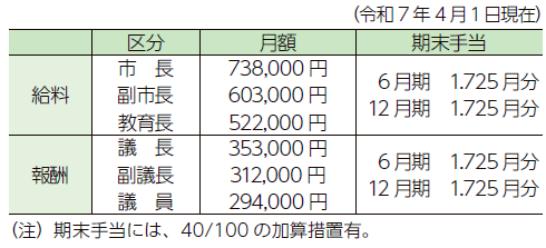 市職員の給与は条例、規則などで定められています。職員の給与には、基本給としての給料と、扶養、住居、通勤手当やボーナスにあたる期末・勤勉手当などがあります。