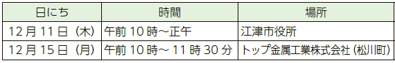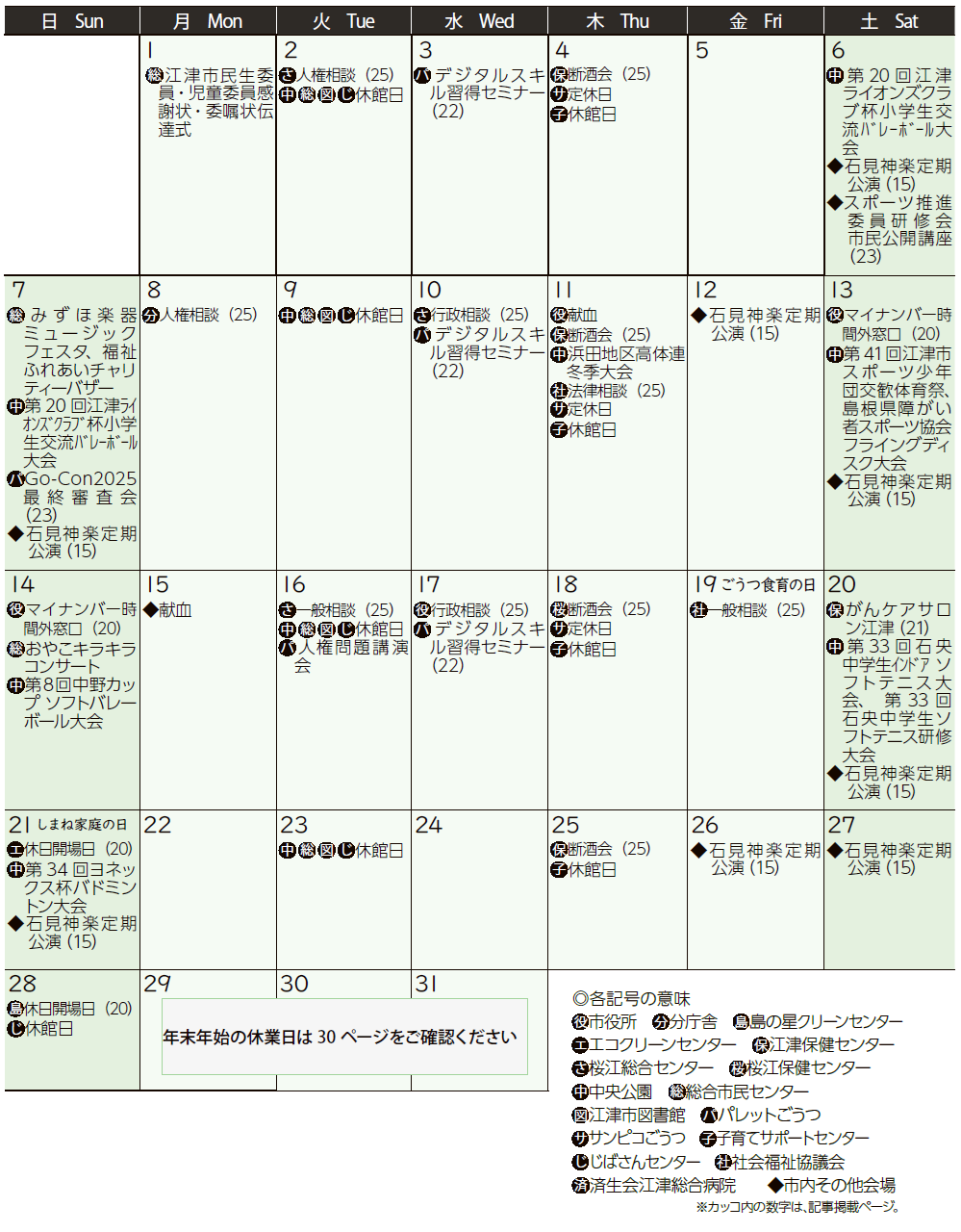 くらし ごうつカレンダー12月 27/30 前の記事 次の記事 発行日 : 2025年12月01日 自治体名 : 島根県江津市 広報紙名 : かわらばん 2025年12月号VOL.888 ■がん検診日程 ■献血日程 Tweet シェアする 年末年始の公共施設などの休業日・年末年始のごみ収集 江津市職員採用資格試験