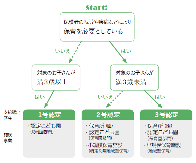 保育施設などを利用するためには、「保育所(園)等利用申込手続き」とは別に子どもの年齢と保護者の就労状況などに応じた「保育の必要性の認定(1~3号)」を受けるための申請が必要です。入園の申し込みと同時に受け付けします。
