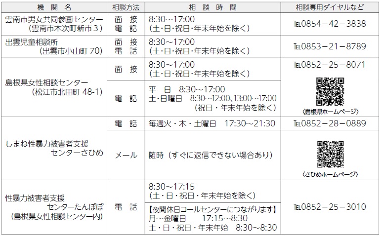 雲南市男女共同参画センターをはじめ次の機関では、女性を対象とした相談窓口を開設しています。気軽にご相談ください。相談は無料で秘密は厳守されます。