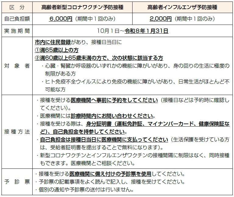 10月から個人の重症化予防やまん延予防を目的として、高齢者を対象とした定期予防接種が始まります。接種後、ウイルスに対する抵抗力がつくまでに2週間程度かかりますので、なるべく早めに受けましょう。