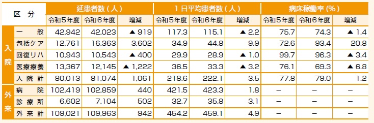 令和6年度は、一般病棟へDPC(診断群分類包括評価)を導入し、医療の標準化・効率化を図りながら、適切な病床管理に取り組みました。入院・外来共に患者数は増え、収益は前年度に比べ増加しました。一方で、物価高騰による経費の増加、人件費高騰により事業費用も増加しました。