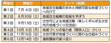 この連続講座は、地域づくりに関心を持つ方、意欲的に関わろうとする方を全市的に発掘し、地域自主組織をはじめとした、雲南市の地域づくりのこれからの担い手につなげることを目的に、雲南市地域自主組織連絡協議会と市との共催で、今年度、7月から12月までの期間で全6回開催しています。