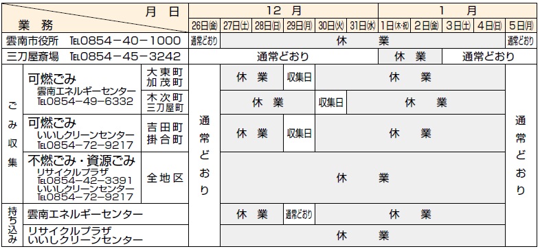 くらし 年末年始の休業日 20/41 前の記事 次の記事 発行日 : 2025年11月20日 自治体名 : 島根県雲南市 広報紙名 : 市報うんなん 2025年12月号 問合せ: ・総務課 【電話】0854-40-1000 ・市民生活課 【電話】0854-40-1031 ・環境政策課 【電話】0854-40-1033 Tweet シェアする 市役所からのお知らせ -お知らせ- 市役所からのお知らせ -暮らし・手続き-