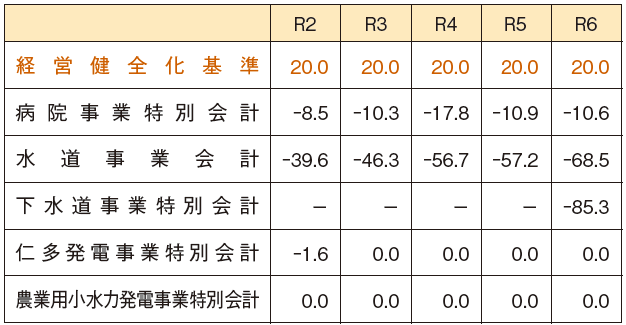 病院事業、水道事業、下水道事業、仁多発電事業、農業用小水力発電事業の5つの特別会計等がこの比率の対象となりますが、いずれの会計でも資金不足は発生していません。