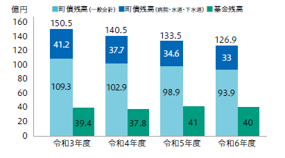 一般会計の町債残高は、繰上償還の実施や町債発行額の減少により、令和5年度から4億9千9百万円減少しました。令和5年度に続き町債残高が100億円を下回りましたが、依然として厳しい状況が続いています。一般会計でみると、本町は同じ規模の団体(類似団体)と比較して、町民一人当たりの町債残高が約1.5倍あり、今後も計画的な事業執行、繰上償還が必要だと考えています。病院・水道・下水道会計の町債残高は1億6千2百万円減少しています。