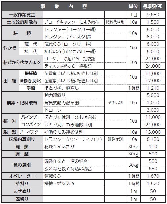 2.作業機械の回送、苗・もみ等の運搬費用は上記金額に含まない。