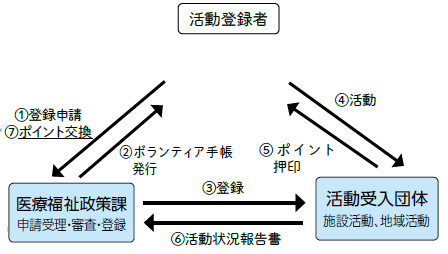☆活動登録をされた方が、施設や地域(活動受入団体)でボランティア活動を行った際に、ボランティア手帳に「ポイント」が付与され、貯まった「ポイント」を商品券等に交換できる仕組みです。