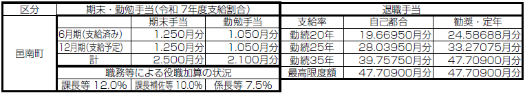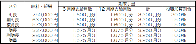 町長、副町長、教育長への退職手当は任期満了ごとに1年につき、報酬の100分の450月、100分の270月、100分の207月分をそれぞれ支給。