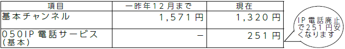 IP電話を廃止されると現在の請求額から月額251円(年額3,012円)安くなります。