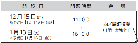 ・昨年までは12~2月の間、島前出張窓口を開設しておりましたが、今年は都合上2月の出張窓口は開設いたしませんのでご了承ください。