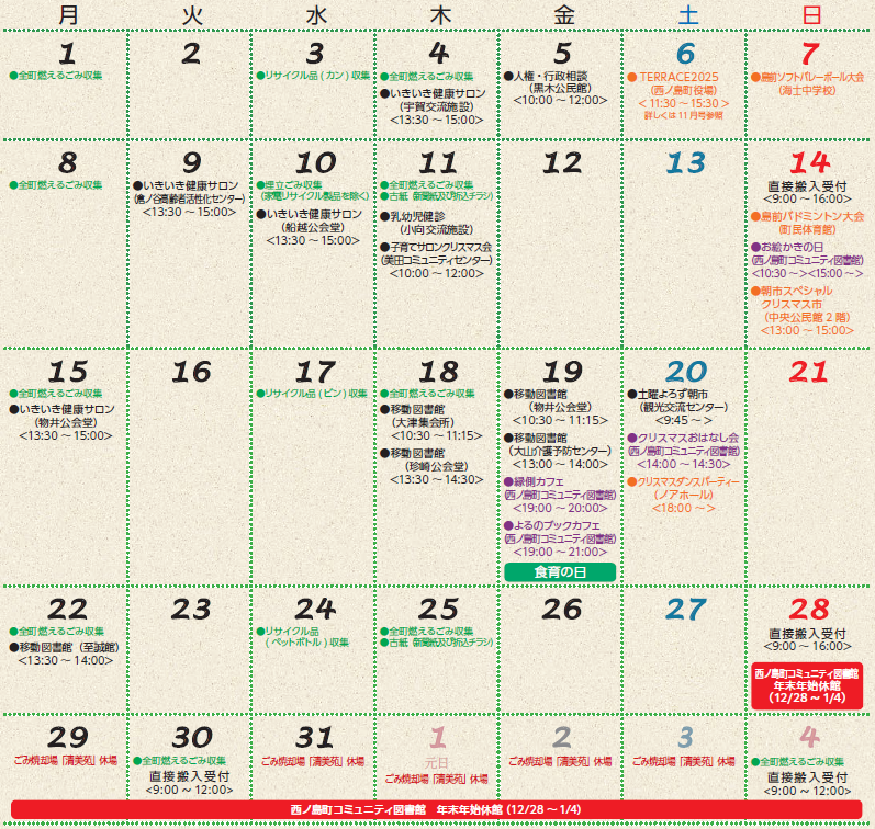 くらし わたしがつくる みんなの「わがとこ」~未来に誇れるまち 西ノ島~2025年12月 29/32 前の記事 次の記事 発行日 : 2025年12月05日 自治体名 : 島根県西ノ島町 広報紙名 : 広報にしのしま 令和7年12月号 ※配食サービスは土日以外実施していますが、12/29(月)~1/2(金)はお休みしますので、ご了承ください。 Tweet シェアする 介護職員・調理員大募集 西ノ島町の人口と世帯数