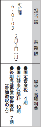 1月分の税金・各種料金の納期限は、表の通りです。(定期口座振替日は1月28日(水)、再振替日は2月10日(火)です。)