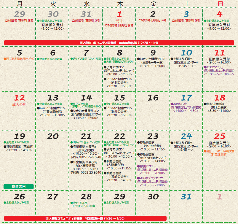 くらし わたしがつくる みんなの「わがとこ」~未来に誇れるまち 西ノ島~2026年1月 27/30 前の記事 次の記事 発行日 : 2026年01月02日 自治体名 : 島根県西ノ島町 広報紙名 : 広報にしのしま 令和8年1月号 ※配食サービスは土日以外実施していますが、12/29(月)~1/2(金)はお休みしますので、ご了承ください。 Tweet シェアする 税務・保険年金係からのお知らせ 西ノ島町の人口と世帯数