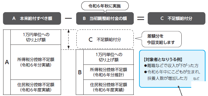 当初調整給付金は、令和6年分の所得税額の確定を待たず、令和5年分の所得等をもとに推計した額で算定されています。そのため、令和6年分の所得税額の確定後に「本来給付すべき額」が「当初調整給付金の額」を上回る場合、その差額を不足額給付分として支給します。(支給額は1万円単位で切り上げ)